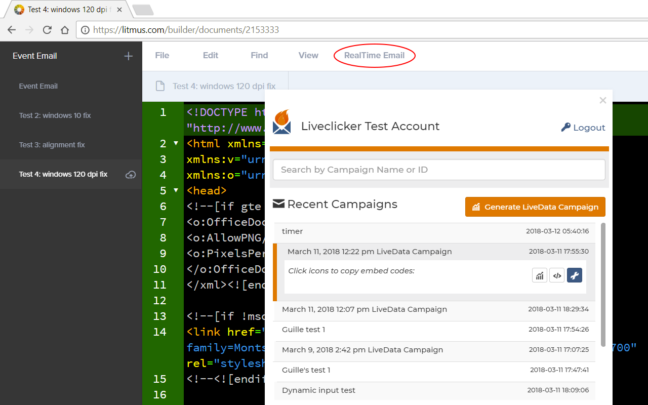 Once the Extension is installed, new Liveclicker buttons within the Litmus Builder interface allow developers to retrieve a list of all live Liveclicker campaigns, so they can easily add the embed tags for those campaigns into the HTML. And if you’re using LiveData—that’s Liveclicker’s analytics feature—you can easily add that through the extension, too.