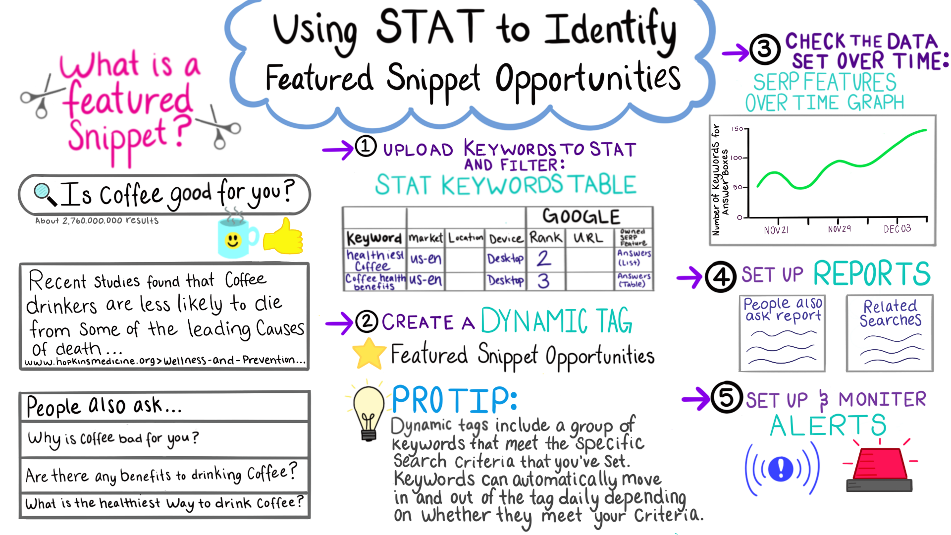 I recommend setting up alerts for this. STAT lets you do this so you’ll be notified any time your ranking goes up or down for your featured snippet target keywords, meaning you’re not going to miss seeing an opportunity. I hope this has been helpful and you’re feeling more prepared to try some of this.