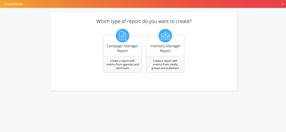 Within the new reporting tab, you will find that the process to generate reports is the same as it was when reporting was siloed under either campaign or inventory manager. If you are an advertiser OR a publisher, you will be directed to the same reporting template that you are familiar with. From here, follow the same workflow to create a report.